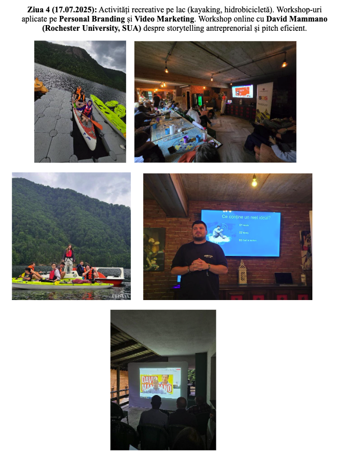 • Ziua 4 (17.07.2025): Activități recreative pe lac (kayaking, hidrobicicletă). Workshop-uri aplicate pe Personal Branding și Video Marketing. Workshop online cu David Mammano (Rochester University, SUA) despre storytelling antreprenorial și pitch eficient.
