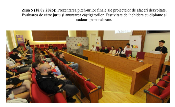 • Ziua 5 (18.07.2025): Prezentarea pitch-urilor finale ale proiectelor de afaceri dezvoltate. Evaluarea de către juriu și anunțarea câștigătorilor. Festivitate de închidere cu diplome și cadouri personalizate.