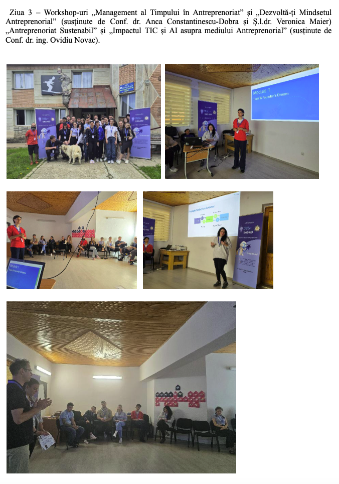 Sesiune de Public Speaking: Participanții și-au prezentat parcursul personal, ideile și afacerile în care sunt implicați, stimulând curajul și inspirația.Workshopuri Interactivă: „Management al Timpului în Antreprenoriat” și„Dezvoltă-ți Mindsetul Antreprenorial” (susținute de Conf. dr. Anca Constantinescu-Dobra și Ș.l.dr. Veronica Maier).„Antreprenoriat Sustenabil” și„Impactul TIC și AI asupra mediului Antreprenorial” (susținute de Conf. dr. ing. Ovidiu Novac).